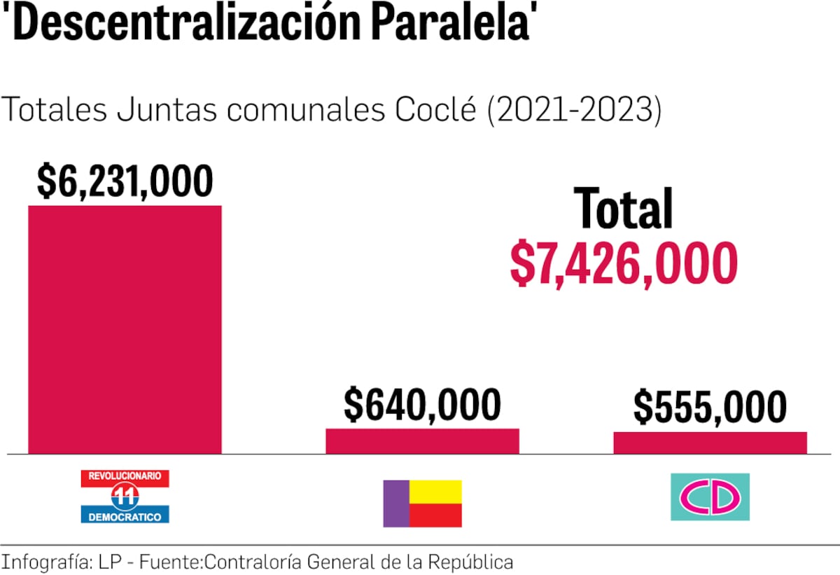 Al examinar el colectivo político del representante de corregimiento de cada junta comunal de la provincia, solo 3 de las 23 juntas comunales bajo el control del PRD no recibieron fondos de la “descentralización paralela”: Río Grande, en Penonomé; Cabuya, en Antón, y Pocrí, en Aguadulce. Es decir, solo el 13% de las juntas comunales del PRD quedó fuera de la “descentralización paralela”.