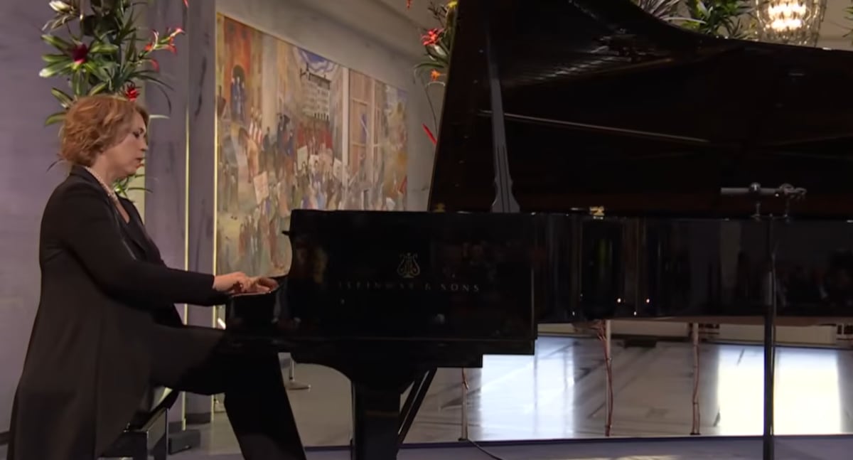 Gabriela Montero además interpreta las notas del Himno Nacional de Venezuela, el Gloria al Bravo Pueblo.