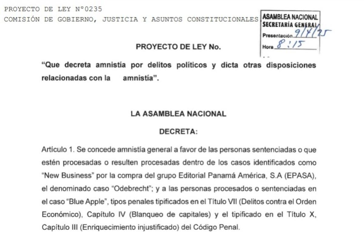 Desde el artículo 1 del proyecto, publicado en la página web de la Asamblea Nacional, se habla de forma explícita del otorgamiento de amnistía a las personas sentenciadas y procesadas en el Caso New Business, así como del Caso Odebrecht.
