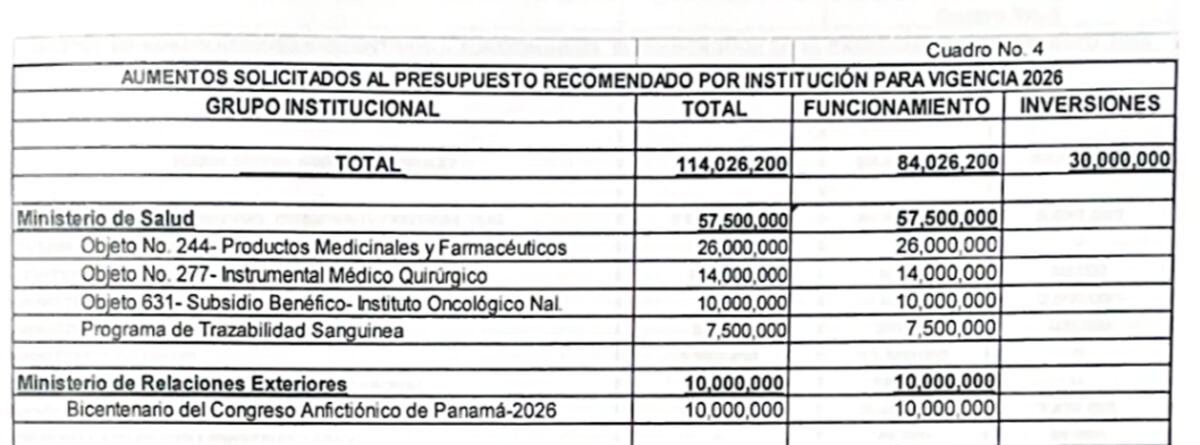 En la recta final para definir el Presupuesto General del Estado de 2026, la Comisión de Presupuesto de la Asamblea Nacional hizo recomendaciones al Ministerio de Economía y Finanzas (MEF) para asignar $57.5 millones adicionales al Ministerio de Salud (Minsa), incluidos dentro de este monto $10 millones para el Instituto Oncológico Nacional (ION).