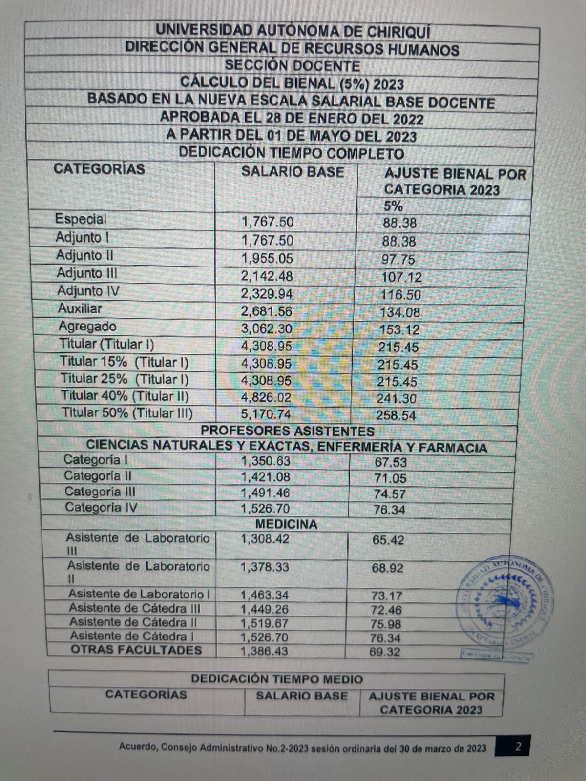 En la Resolución 01-2023 también se establece que el Consejo Administrativo de la universidad acordó, el 28 de octubre pasado, el incremento salarial “en concepto de bienal correspondiente a la categoría y dedicación que mantenga el docente al 1 de mayo”.
