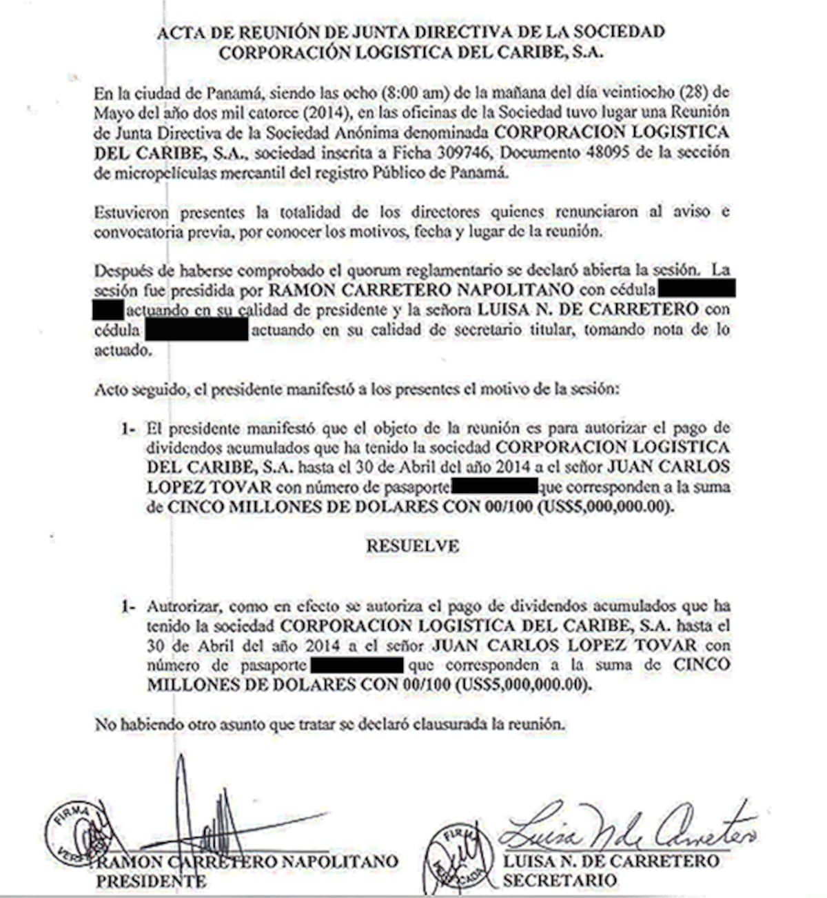 Así, la Corporación Logística del Caribe, S.A, otra sociedad de los Carretero Napolitano, solicitó el 28 de mayo de 2014 ante la junta directiva pagar $5 millones a López Tovar. La orden fue firmada por el propio Ramón Carretero apenas dos semanas después de que el gobierno de Maduro desembolsara desde el Fonden $20.6 millones a favor de Lanvicorp.
