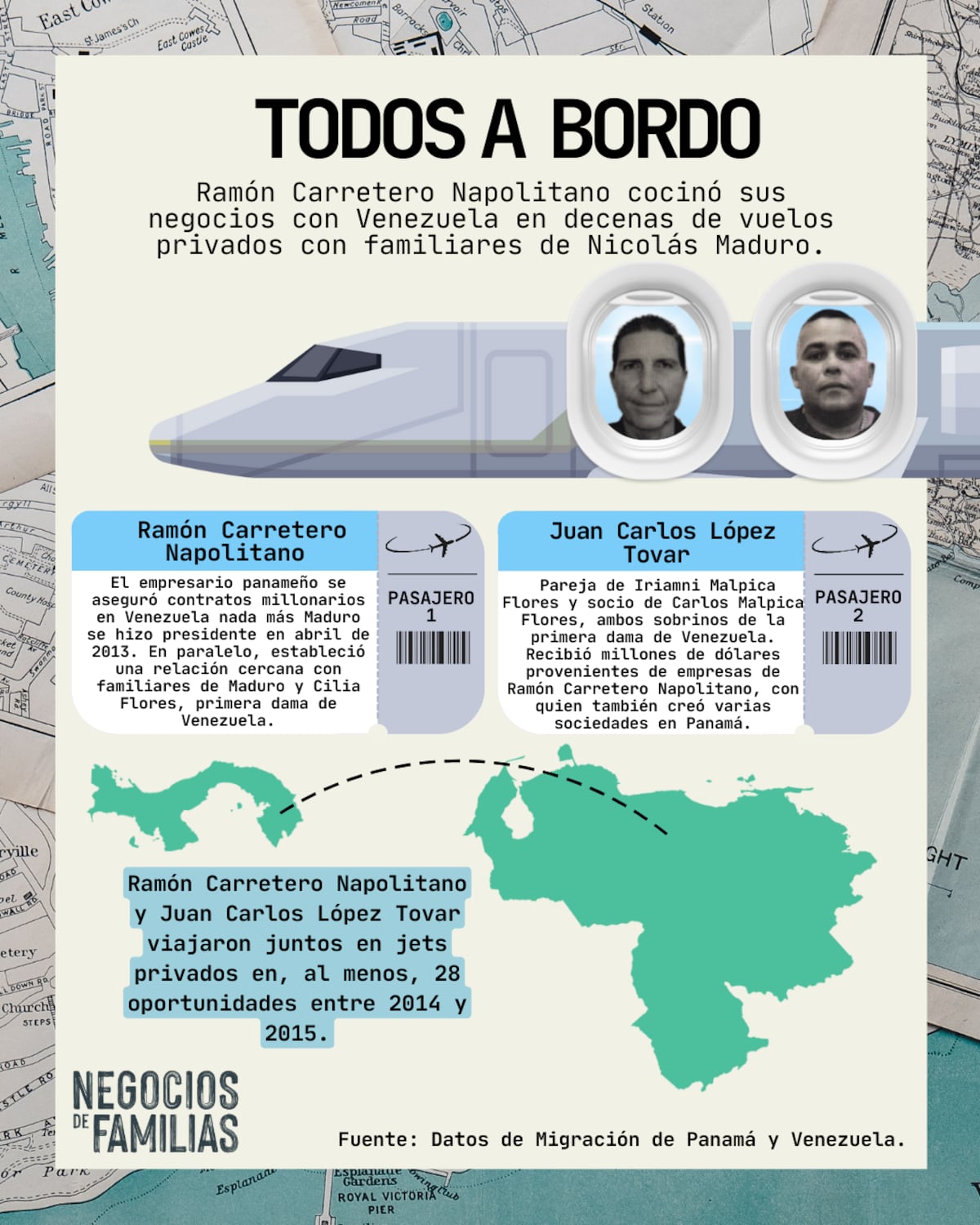 López Tovar y Carretero Napolitano mantuvieron una relación estrecha desde 2014, justo cuando el empresario fue beneficiado con contratos públicos. No sólo compartieron decenas de vuelos privados que conectaban Venezuela y Panamá, sino que el sobrino político de Cilia Flores y el empresario se convirtieron en socios de tres compañías.