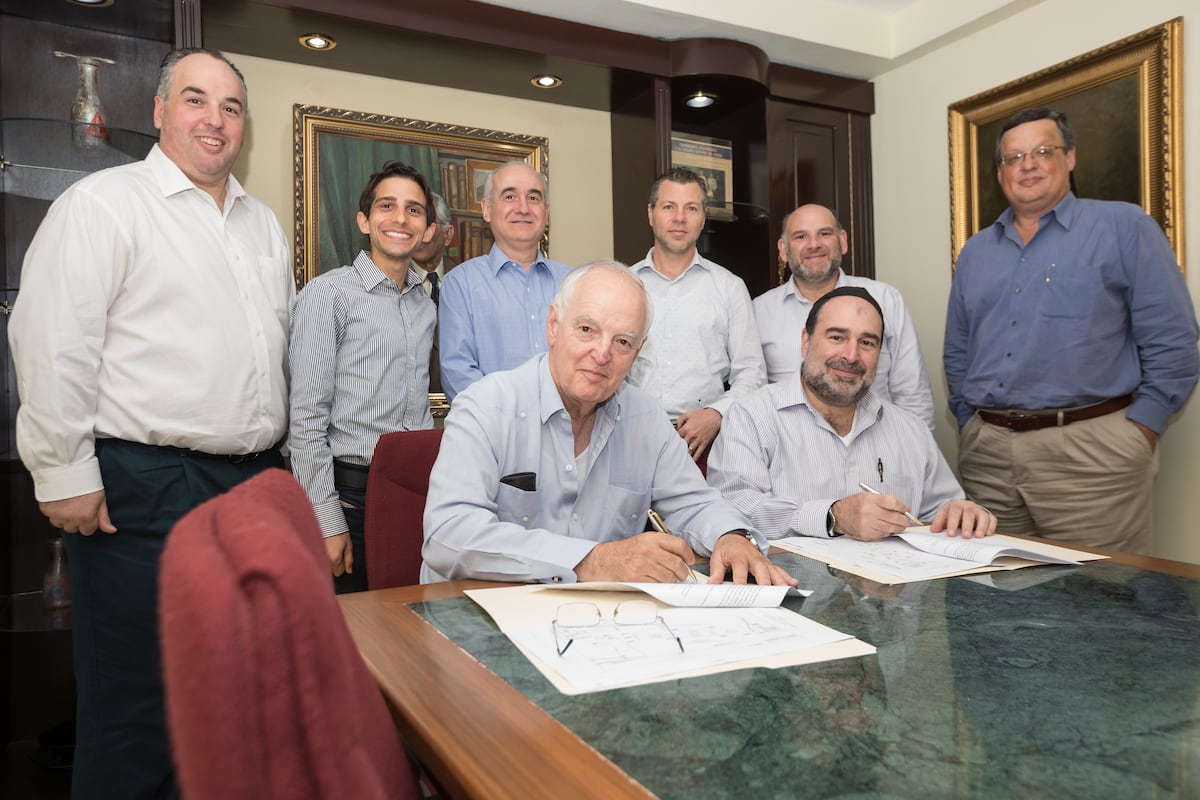 En la gráfica se observan los firmantes del Acuerdo de Donación, Señor Moises Sion Harari Abadi por la Asociación Yeshiva Har Sinai y Manuel J. Paredes L. en representación de Grupo Lefevre. También participaron del acto de firma los señores Hilel Ariel Khafif G., Michael Harari, Morris Isaac Harari, Manuel José Paredes A., Francisco A. Paredes A. y Miguel A. De Janón S.
