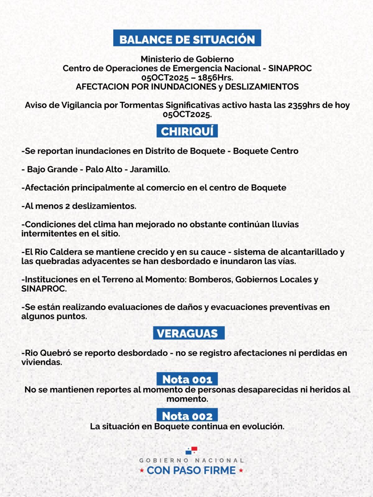 El Cuerpo de Bomberos de Boquete, en coordinación con el Sistema Nacional de Protección Civil (Sinaproc), mantiene labores de evaluación de daños y monitoreo en las zonas vulnerables para garantizar la seguridad de los residentes y atender posibles emergencias.