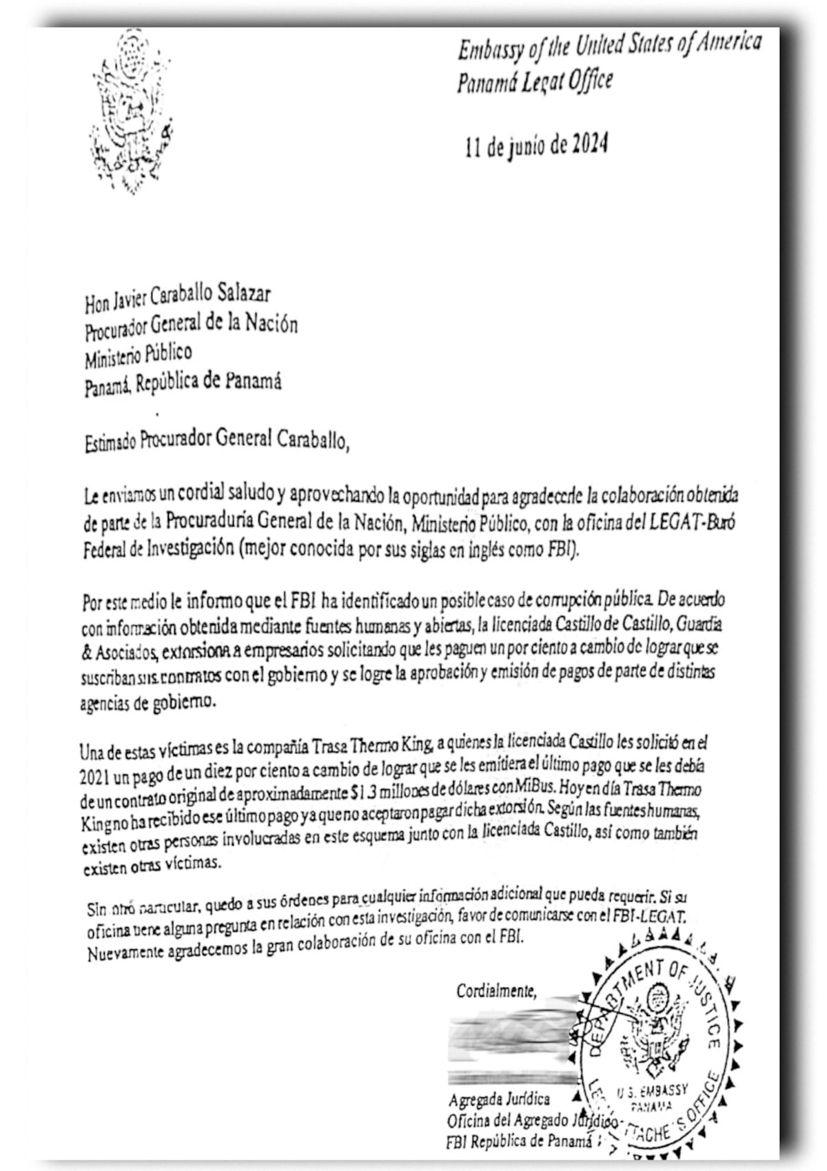 La carta del FBI —que solo menciona un caso— está firmada por la persona en la Embajada de Estados Unidos que ejerce el cargo de agregado jurídico de la Oficina del Agregado Jurídico, FBI República de Panamá.