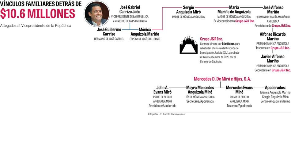 Anguizola no sólo es apoderado de Mercedes D. De Miró e Hijas, S.A. y suegro de José Guillermo Carrizo. También mantiene una estrecha relación con el vicepresidente José Gabriel Carrizo, quien aparece o aparecía en varias de las sociedades familiares de Anguizola como suscriptor, agente residente o como parte de su directiva, junto con su hermano José Guillermo, el yerno de Anguizola.